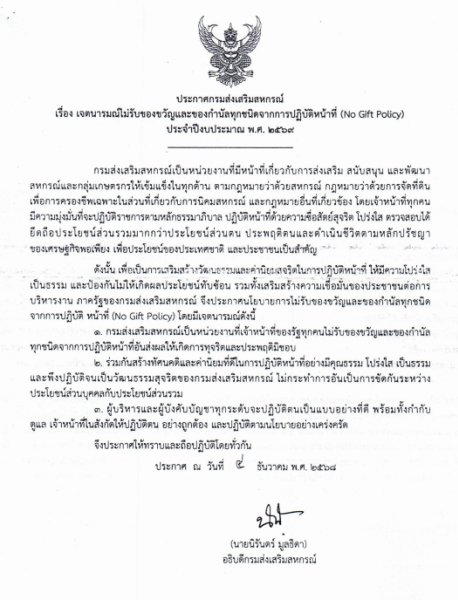 เจตนารมณ์ไม่รับของขวัญและของกำนัลทุกชนิดจากการปฏิบัติหน้าที่ (No Gift Policy) ประจำปีงบประมาณ พ.ศ.2569